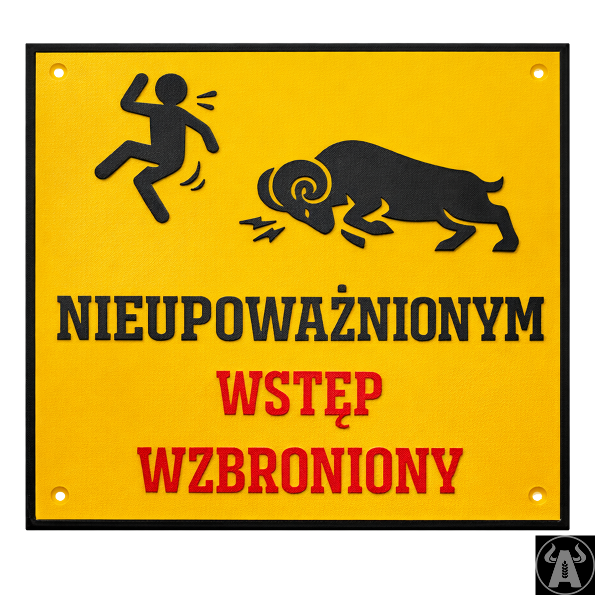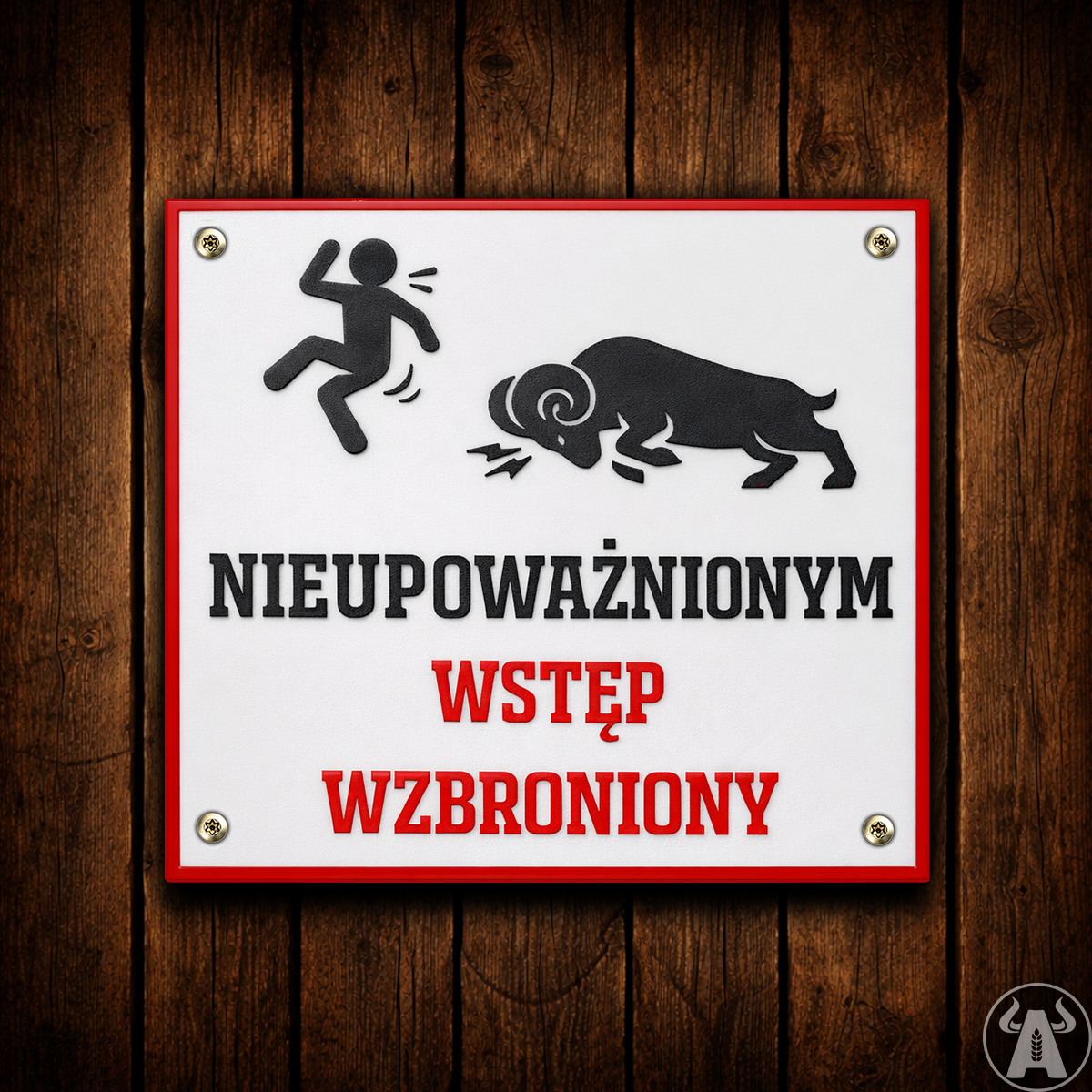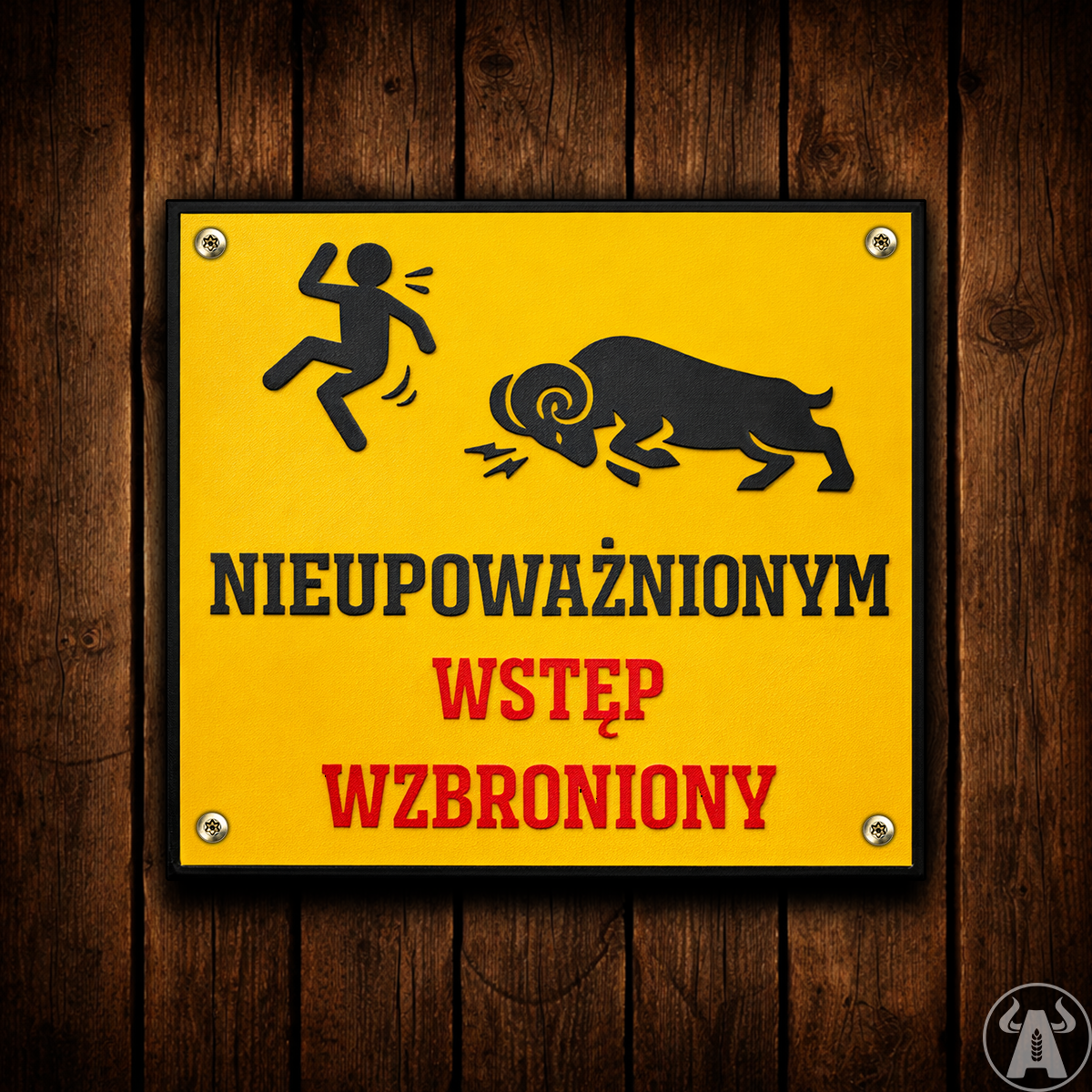 To nie jest „grzeczny baranek z bajki” :) Ten tutaj ma swoje zdanie i swój teren. Tabliczka idealnie sprawdzi się na wejściu do zagrody, na bramie albo tam, gdzie lepiej, żeby obcy nie wchodzili. Grafika mówi sama za siebie: wstęp tylko dla upoważnionych.