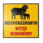 Tabliczka informacyjno-ostrzegawcza z napisem „Nieupoważnionym wstęp wzbroniony” oraz grafiką owcy z jagnięciem to czytelne oznaczenie miejsc, do których dostęp powinien mieć wyłącznie gospodarz lub obsługa. Sprawdza się szczególnie przy wejściu do owczarni, zagrody, na wybieg lub w innych częściach gospodarstwa związanych z hodowlą.