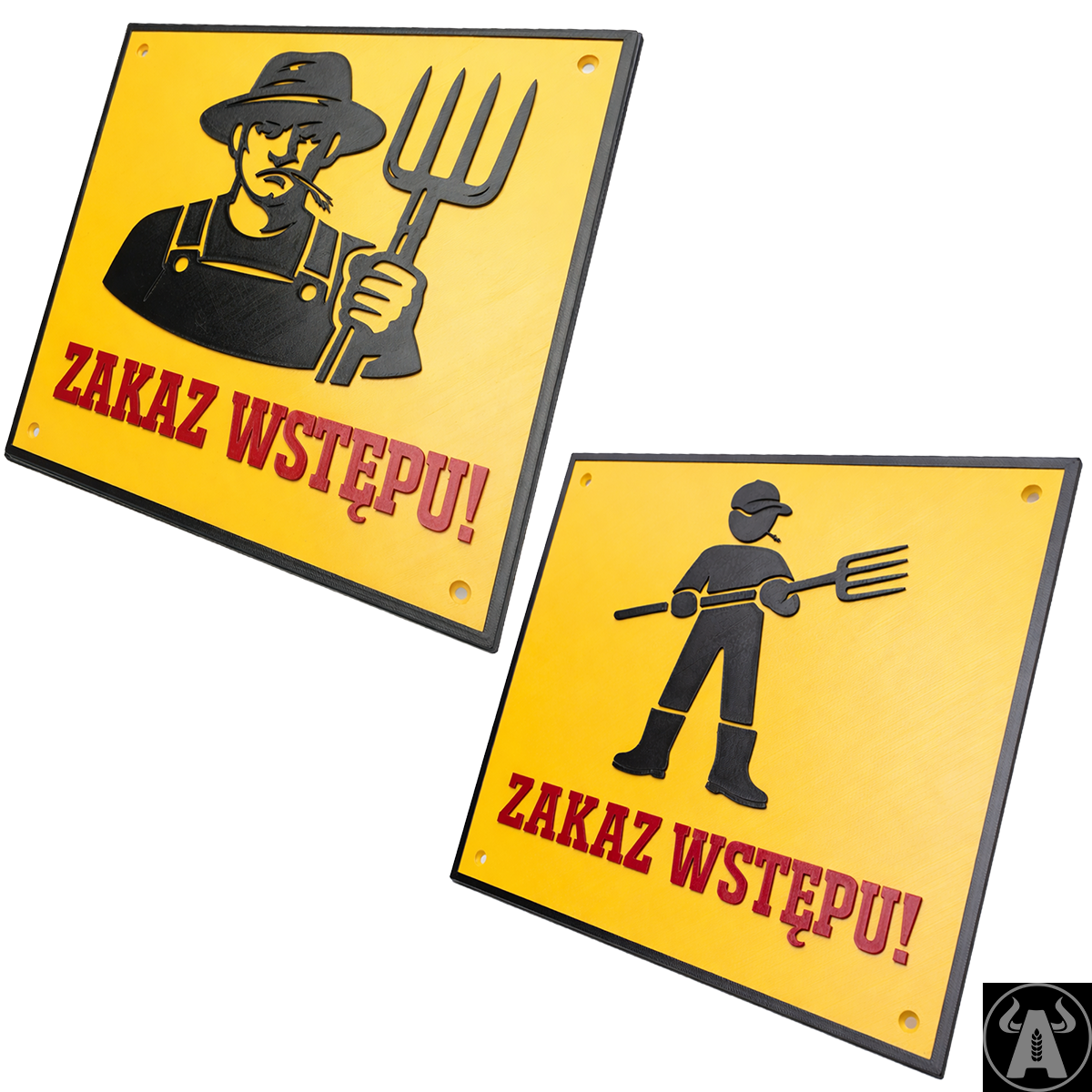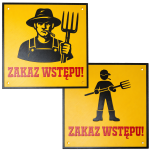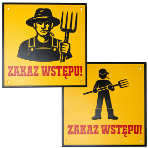 Motyw rolnika z widłami to klasyk na gospodarstwo - od razu wiadomo, że to teren prywatny i lepiej nie wchodzić bez zaproszenia. Dostępne są 2 warianty tabliczki: