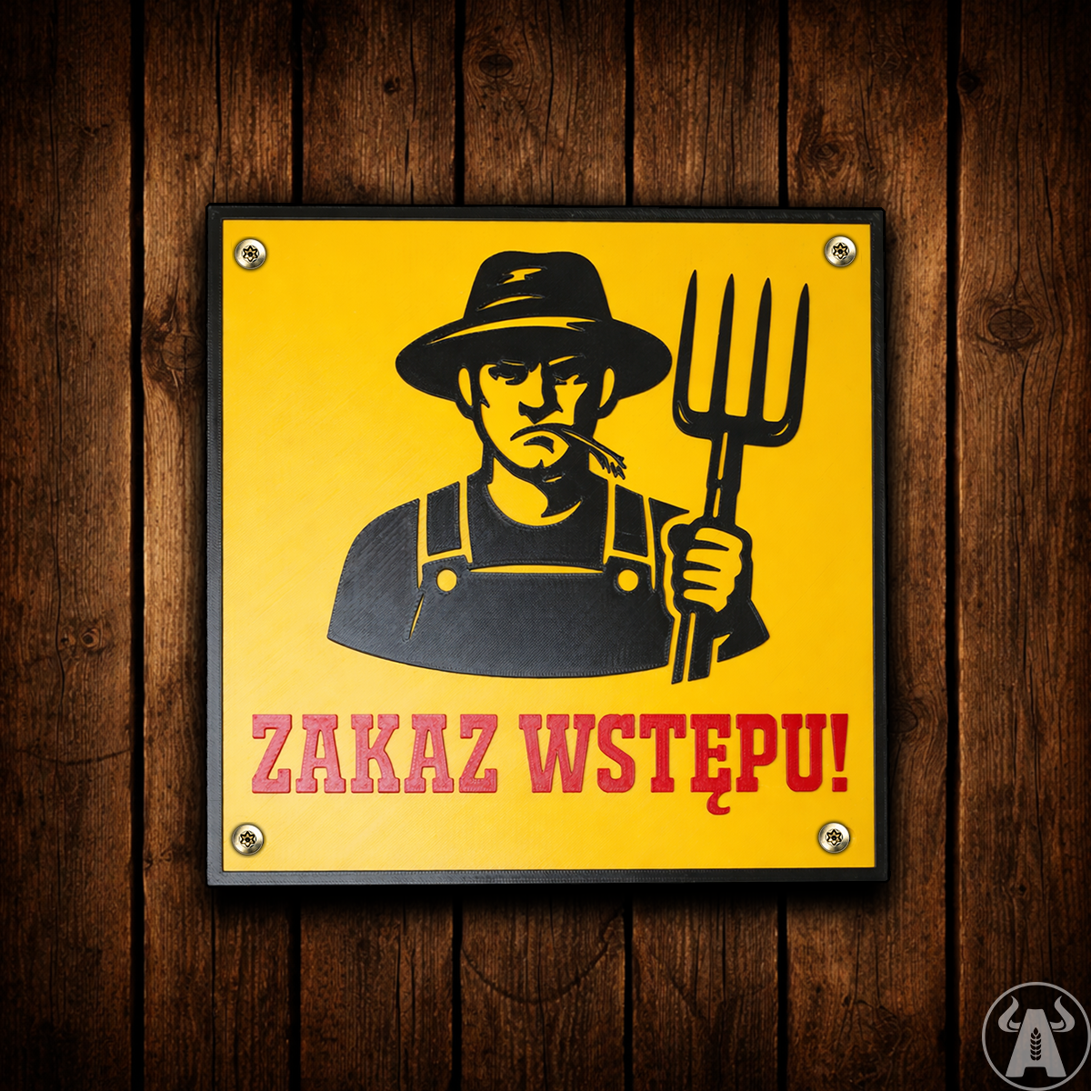 Tabliczka 3D „Zakaz wstępu!” z motywem rolnika - zabawne oznaczenie na furtkę lub bramę.