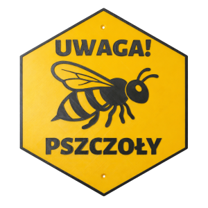 Tabliczka ostrzegawcza przeznaczona do oznaczenia pasieki oraz miejsc, w których przebywają pszczoły. Zastosowany kształt sześciokąta nawiązuje do plastra miodu, dzięki czemu tabliczka od razu kojarzy się z pszczelarstwem i wyróżnia się na tle standardowych oznaczeń. Czytelny napis „Uwaga! Pszczoły” oraz wyrazista grafika informują o ryzyku wejścia na teren pasieki, gdzie może dojść do użądlenia.