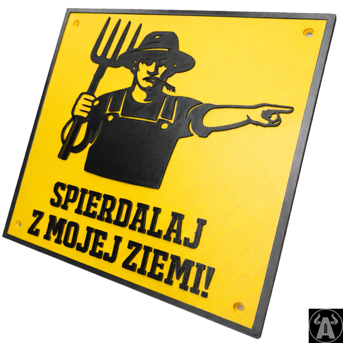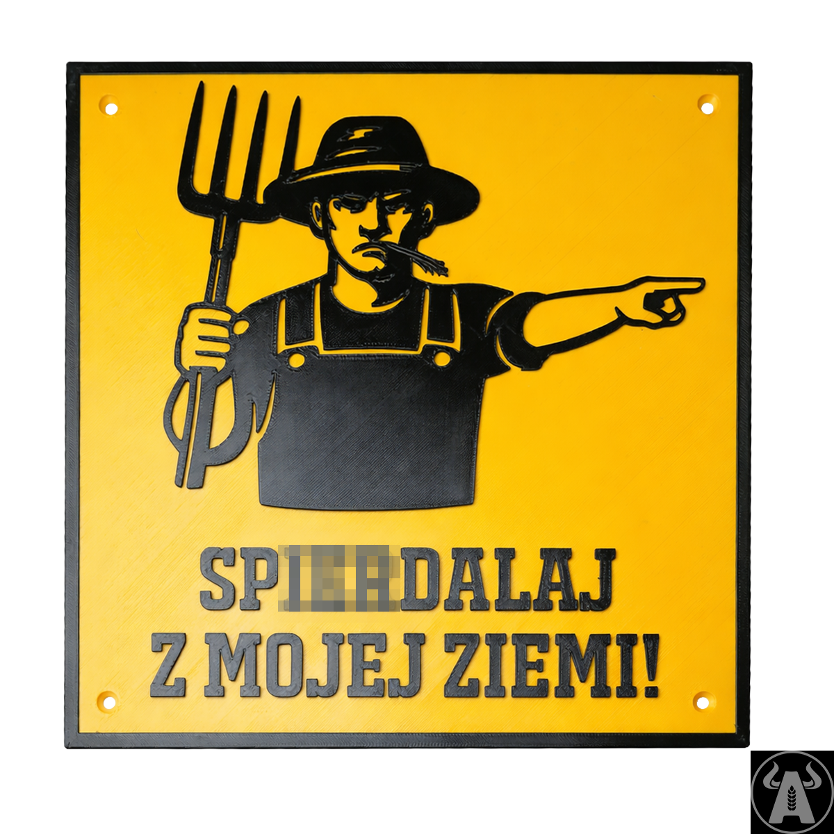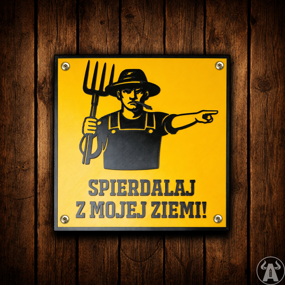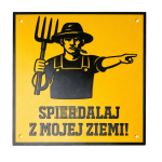 Ta tabliczka to propozycja dla osób z dystansem i poczuciem humoru — „Uwaga, Zły Gospodarz” z dosadnym tekstem "SPI!@#ALAJ Z MOJEJ ZIEMI!", który od razu ustawia nieproszonych gości. Grafika rolnika z widłami i „wskazującą ręką” robią efekt od pierwszego spojrzenia: komunikat jest jasny, a forma świetnie pasuje na furtkę, bramę wjazdową, podwórko albo w okolice budynków.